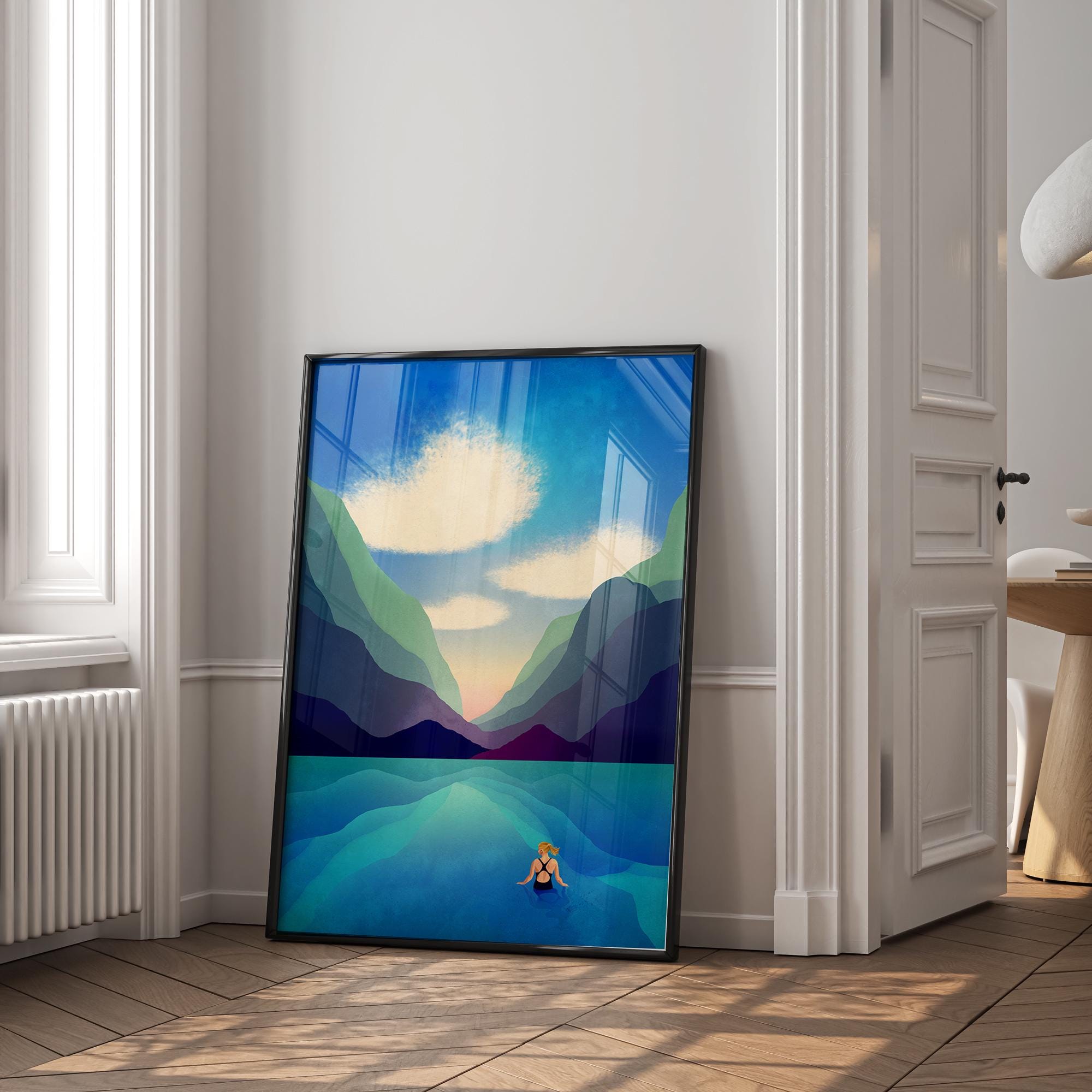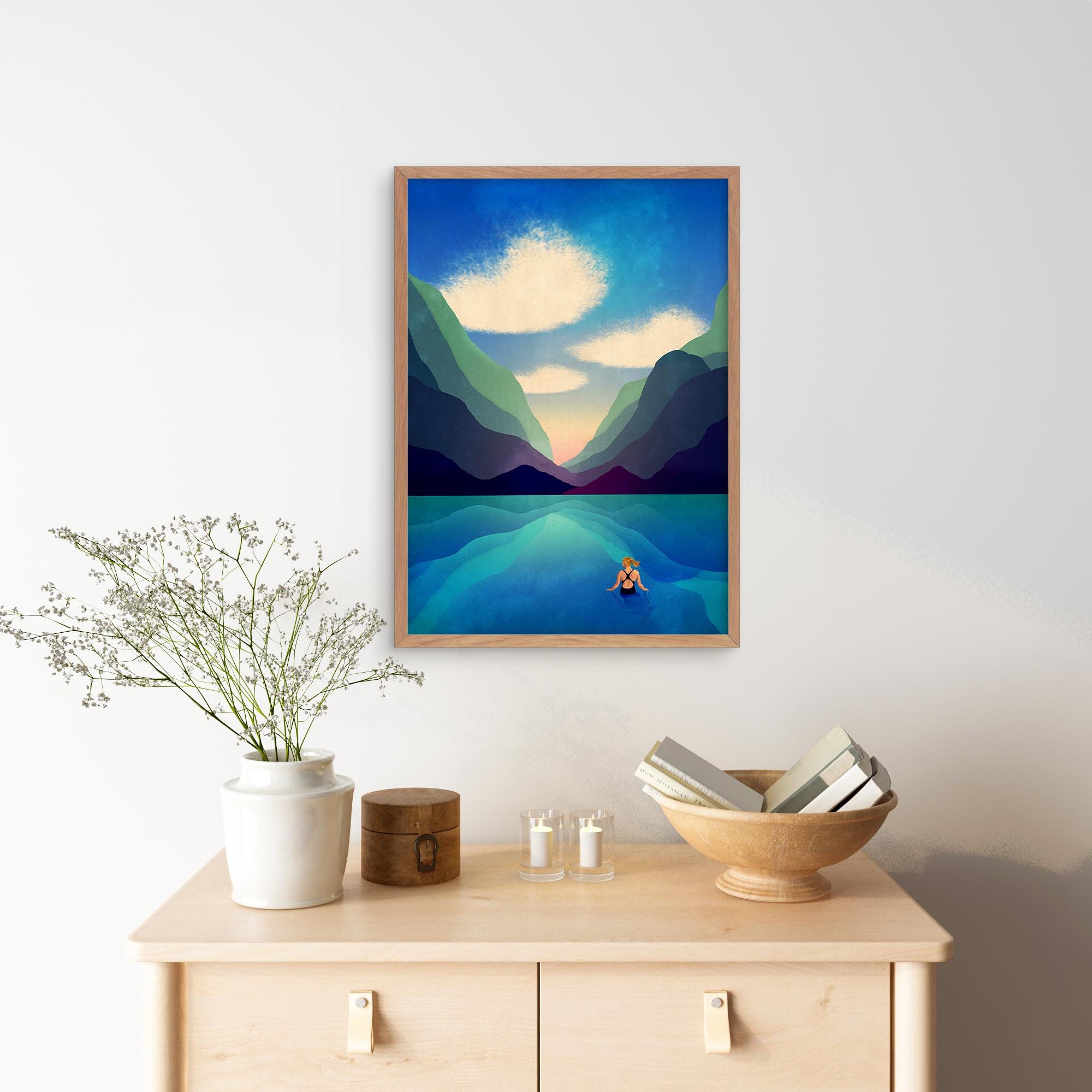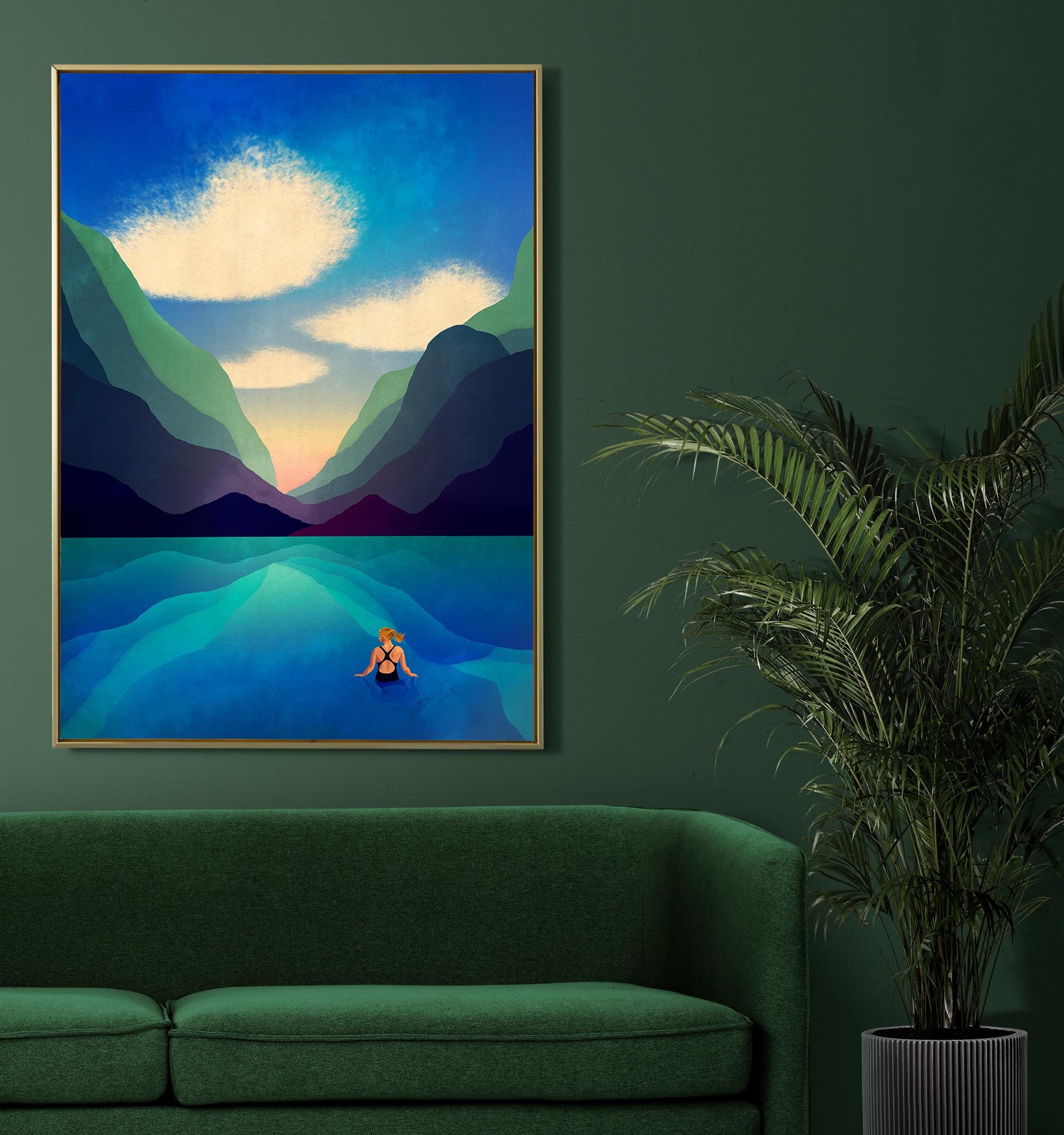 This fine art print is inspired by swimming in a clean lake surrounded by large trees and silence. Ideal print for decorating your living room or office.