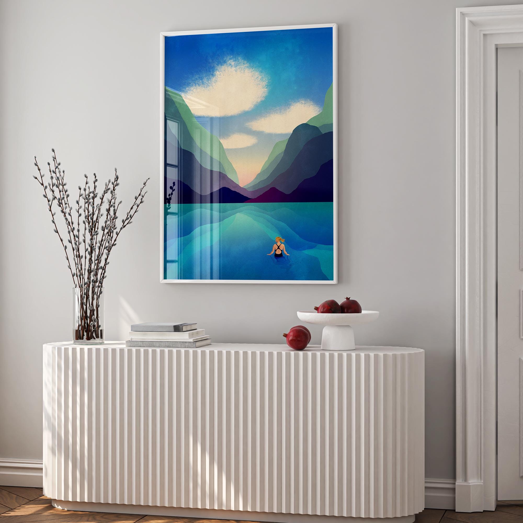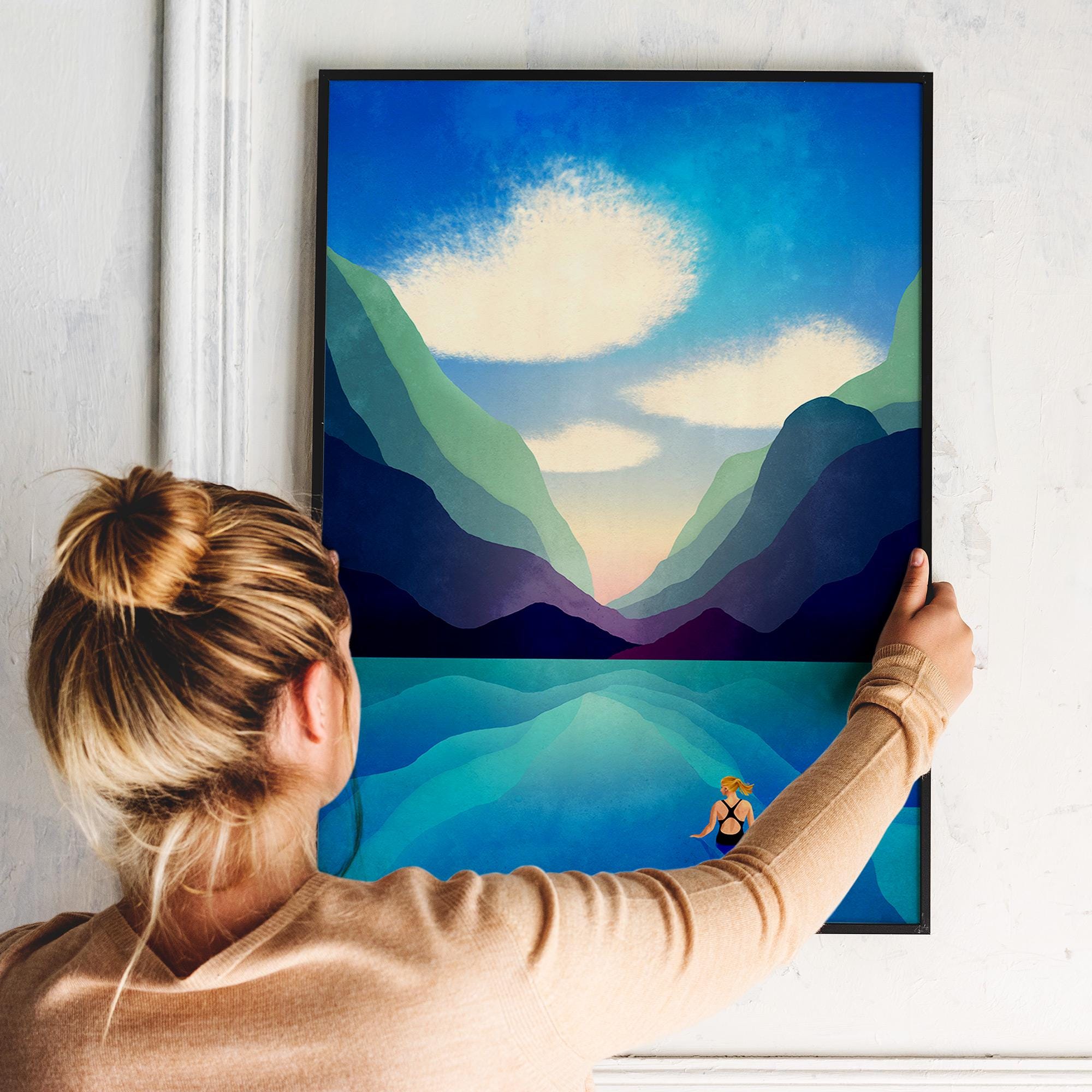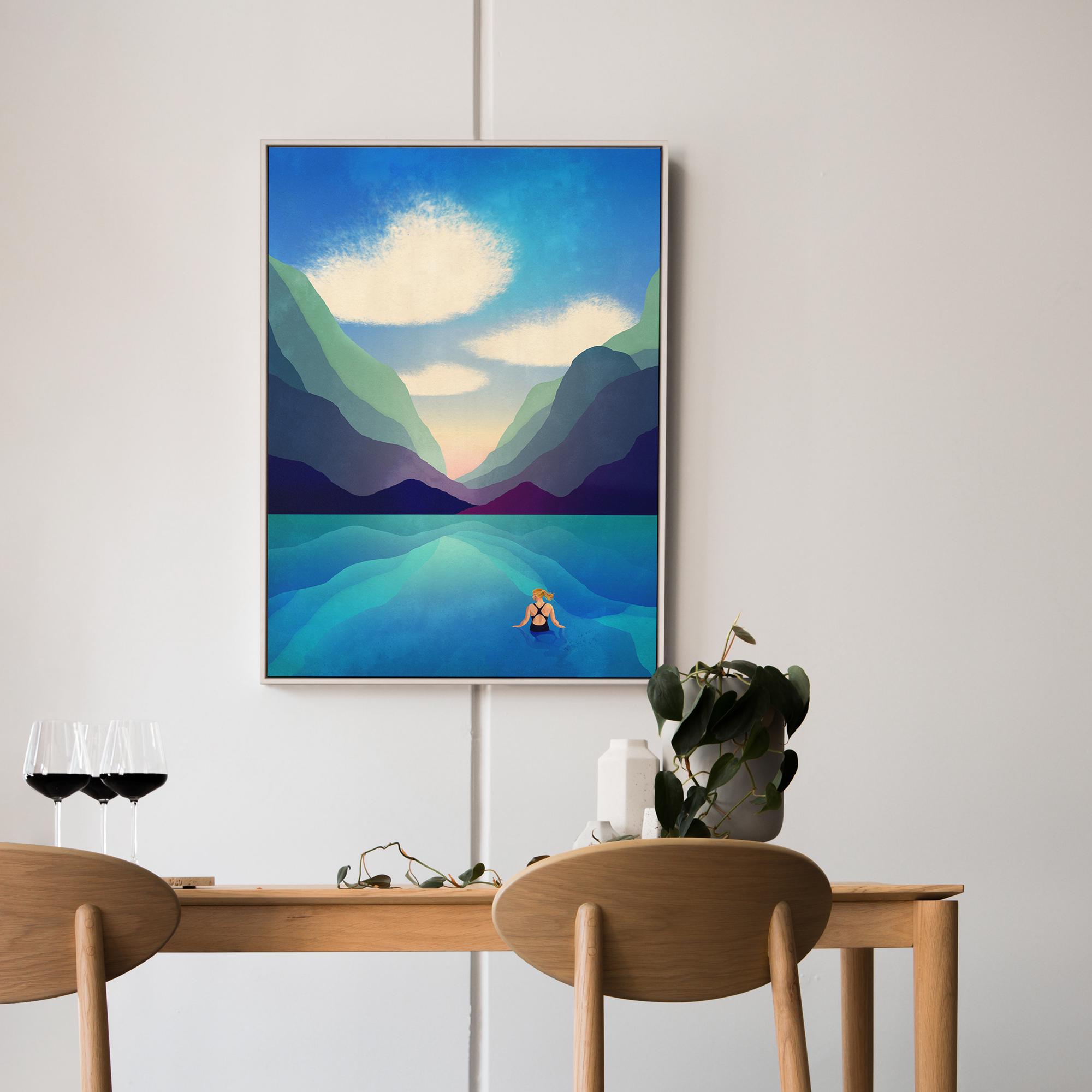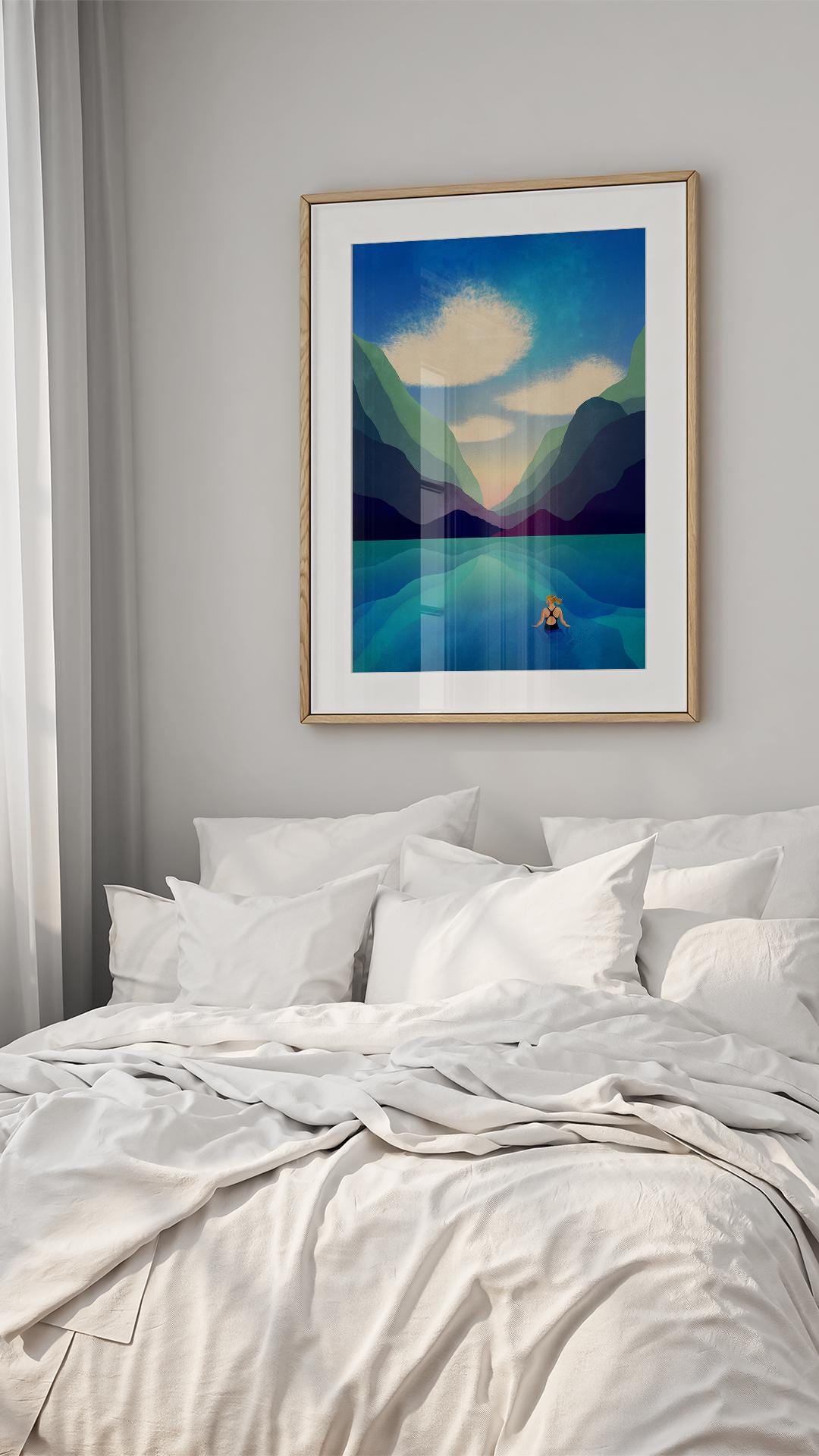 This fine art print is inspired by swimming in a clean lake surrounded by large trees and silence. Ideal print for decorating your living room or office.