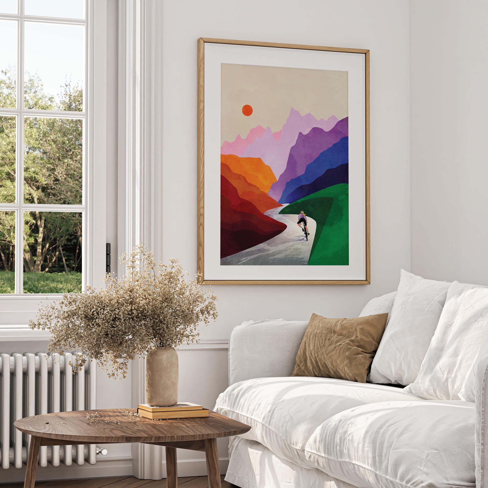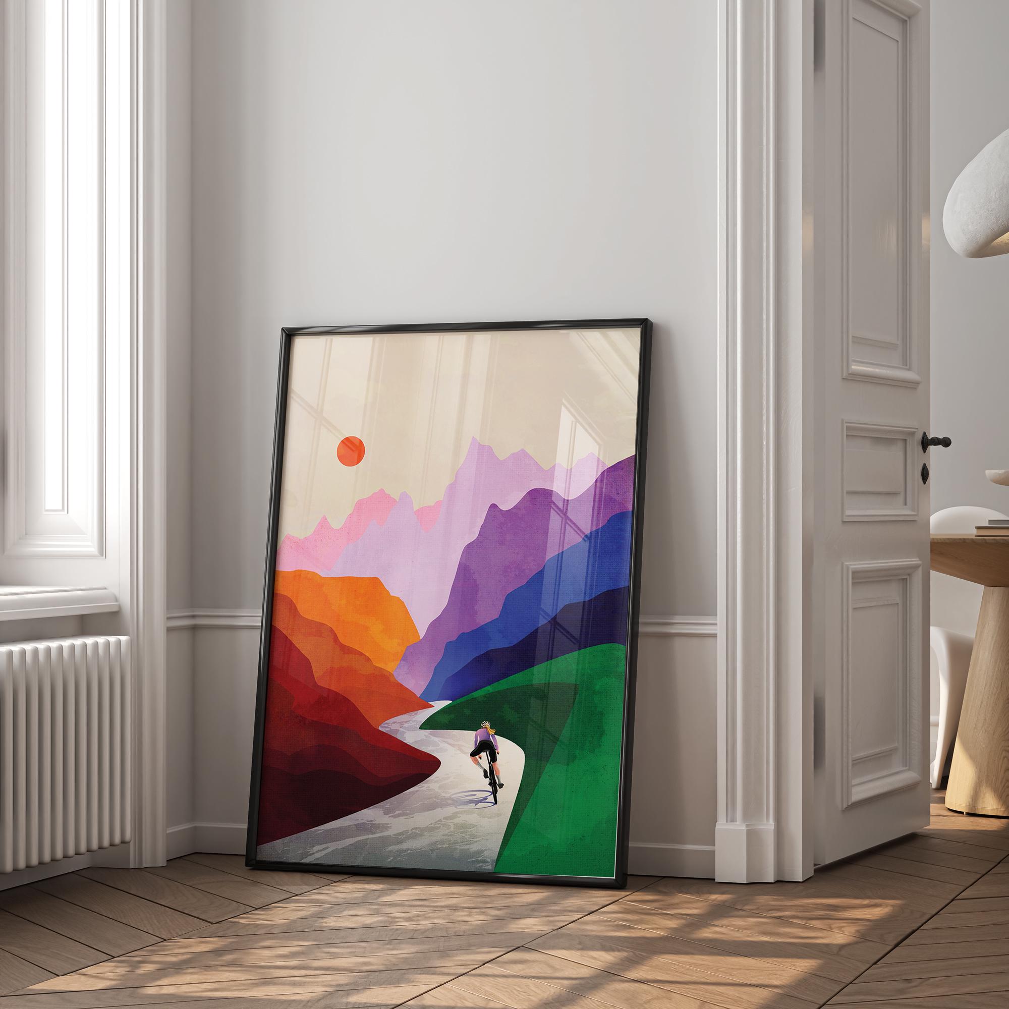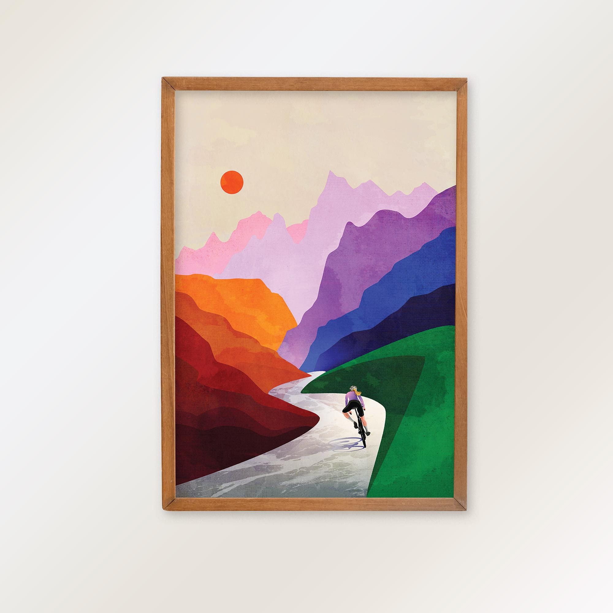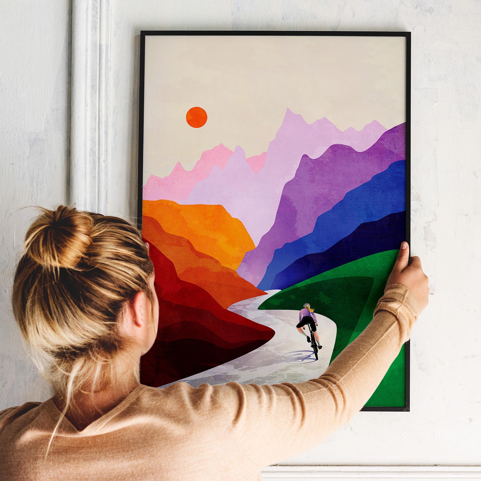 Fine art print of a woman descending down the mountain. Great gift for cyclists and a perfect motivational poster.